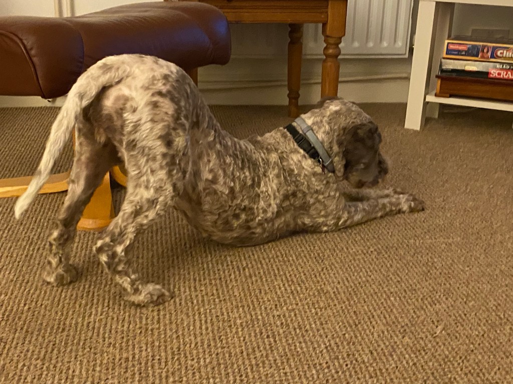 Lottie’s been doing yoga to keep in shape. This is her version of Downward Dog.